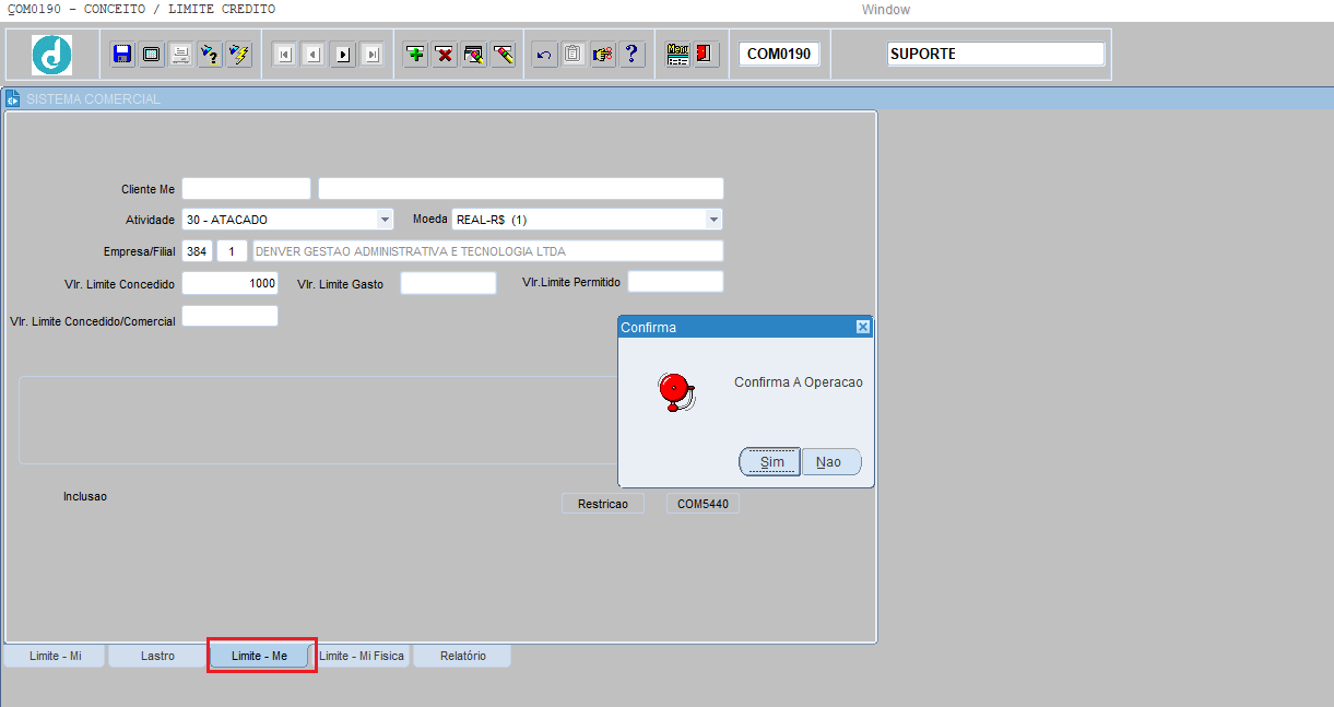 A aba LIMITE ME (MERCADO EXTERNO) , é utilizada para conceder e/ou atualizar limite de credito para ME (Mercado Externo).