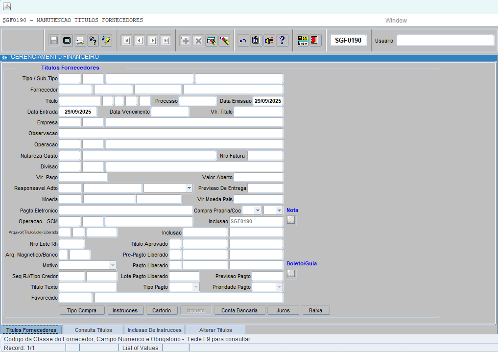 Importante: Após a geração, os títulos estarão disponíveis também na tela SGF0190 – Manutenção de Títulos de Fornecedores.