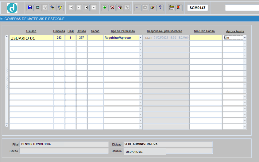 O aprovador deverá ser configurado pelo SCM0147, para o Depto/Seção (caso não preencher a seção, o sistema entende-se como "geral") com o Tipo “Requisitar/Aprovar”, e o “Aprova Ajuste” como “Sim”, conforme abaixo: