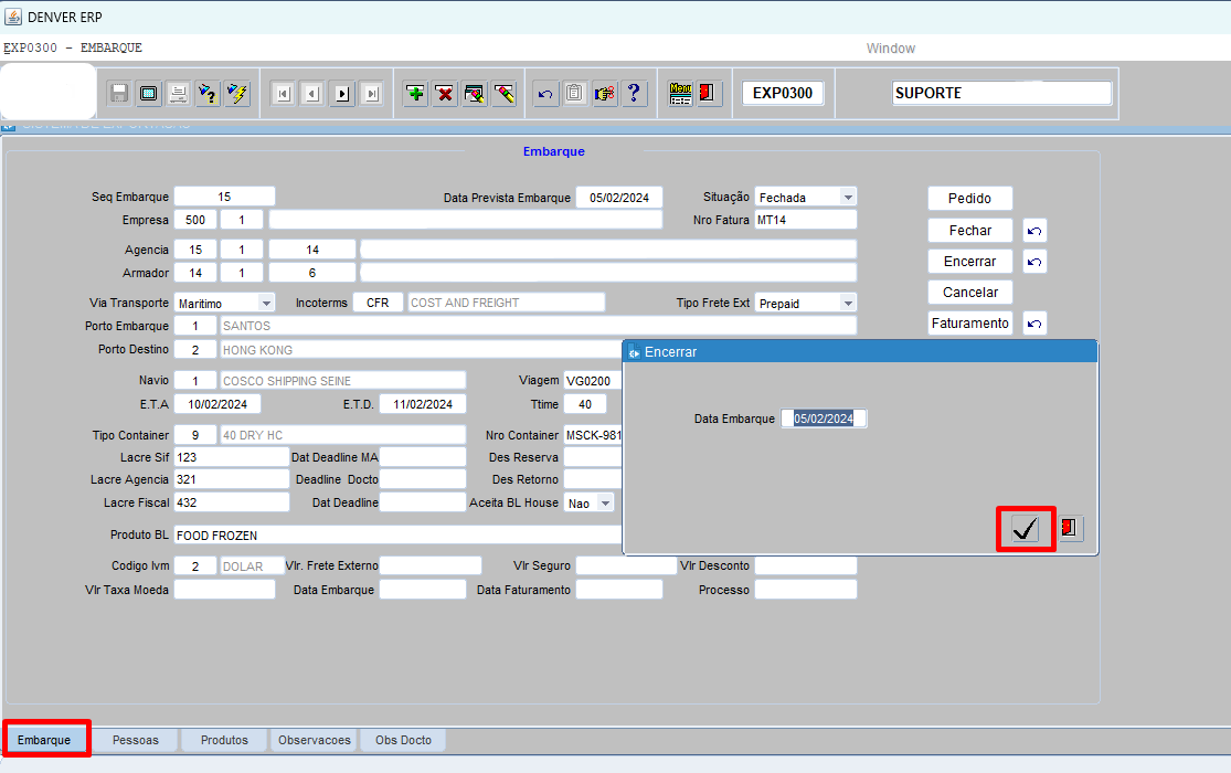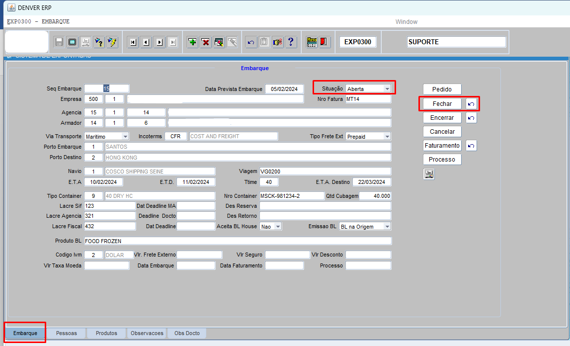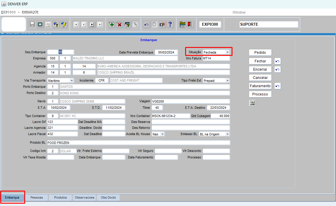 Após conferir todas as informações [clicar] em encerrar, a situação passara de fechada, para embarcada.