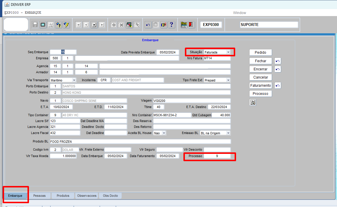 Na aba embarque para encerrar embarque, faturar e gerar processo de exportação.