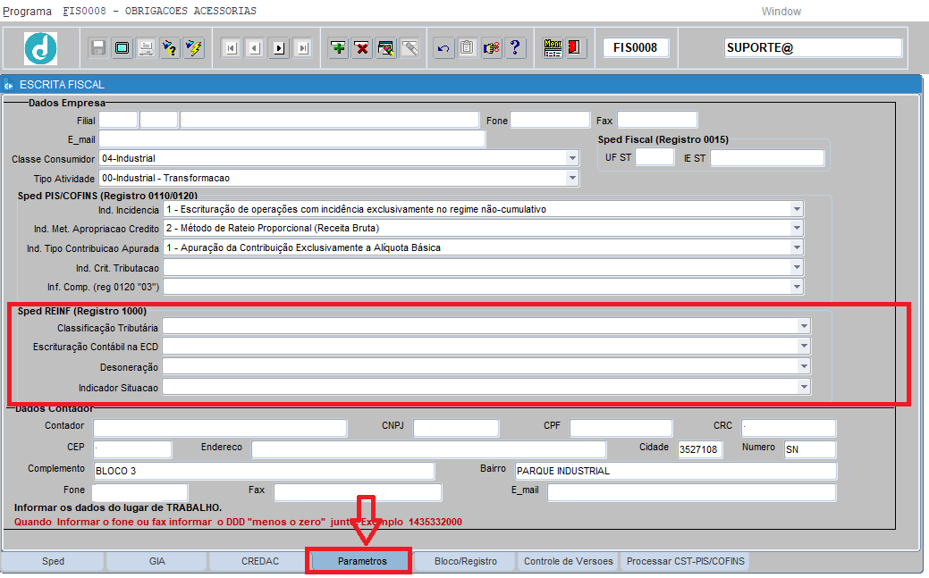 Referente ao cadastro da filial que representa o Registro do R-1000 busca as informações da tela FIS0008, aba Parâmetros. Além dos campos padrões, foram colocados alguns campos específicos do Reinf conforme destacado na tela abaixo: