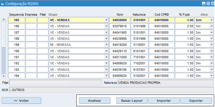 Dentre os facilitadores disponibilizados aos usuários a função Análise, essa função traz todas as naturezas e NCM exercidas pela empresa, o sistema Denver disponibiliza essa análise já em formato para importação.