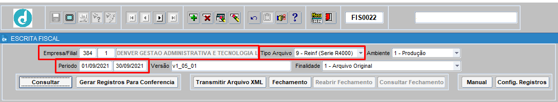 Colocar Empresa/Filial, período, Finalidade e clicar no botão “Gerar Registros para Conferência”: