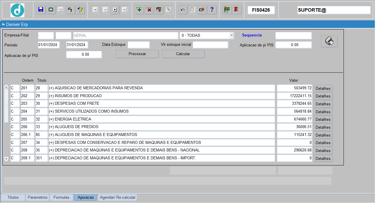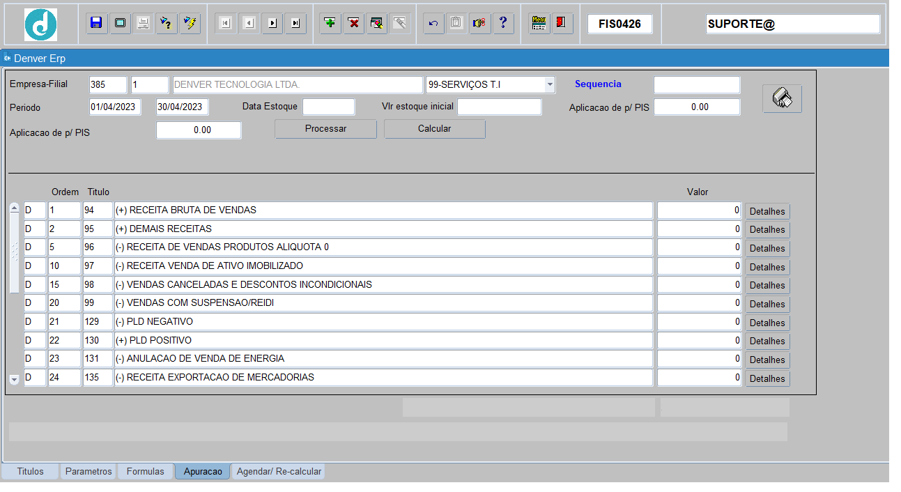 Esse sistema é possível efetuar o cadastro de títulos, subtítulos e fórmulas para a geração da apuração do PIS e COFINS o período (mês/ano).