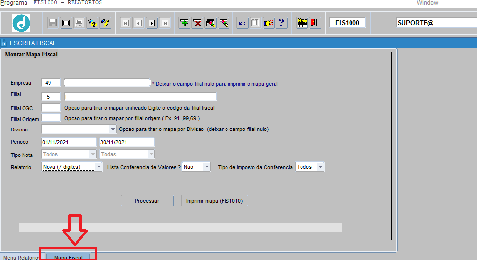 Essa aba traz o relatório mais utilizado junto ao fiscal, é com a geração do mapa fiscal é que possível conferir os Cfop’s, créditos e débitos fiscais e informações cadastrais do cliente e do fornecedor, é com o mapa fiscal que é possível apurar impostos, e também efetuar a conferência junto as obrigações acessórias, SPED FISCAL, CONTRIBUIÇÕES e GIA. Tal relatório é também muito utilizado pela contabilidade, para conferencia a conciliação dos cfops com as contas contábeis.