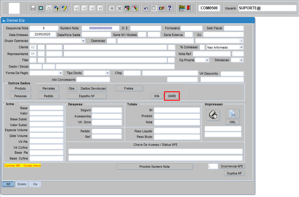 NF (F9). Ao pressionar F9, será disponibilizado uma lista com as notas que estão disponíveis para realizar o processo de forma manual. Ao selecionar uma delas, os demais campos a seguir serão informados de forma automática.