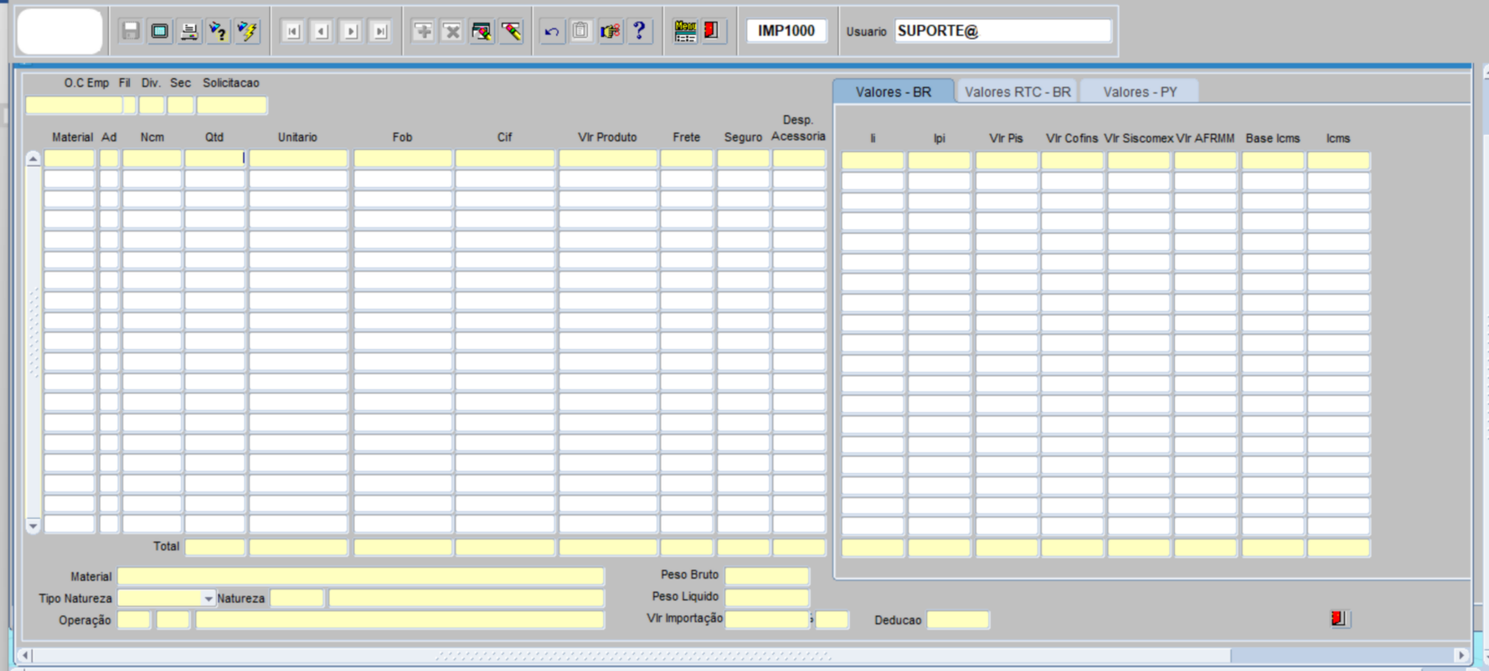•IMPORTAÇÃO: Informar o tipo de importação; input manual obrigatório.