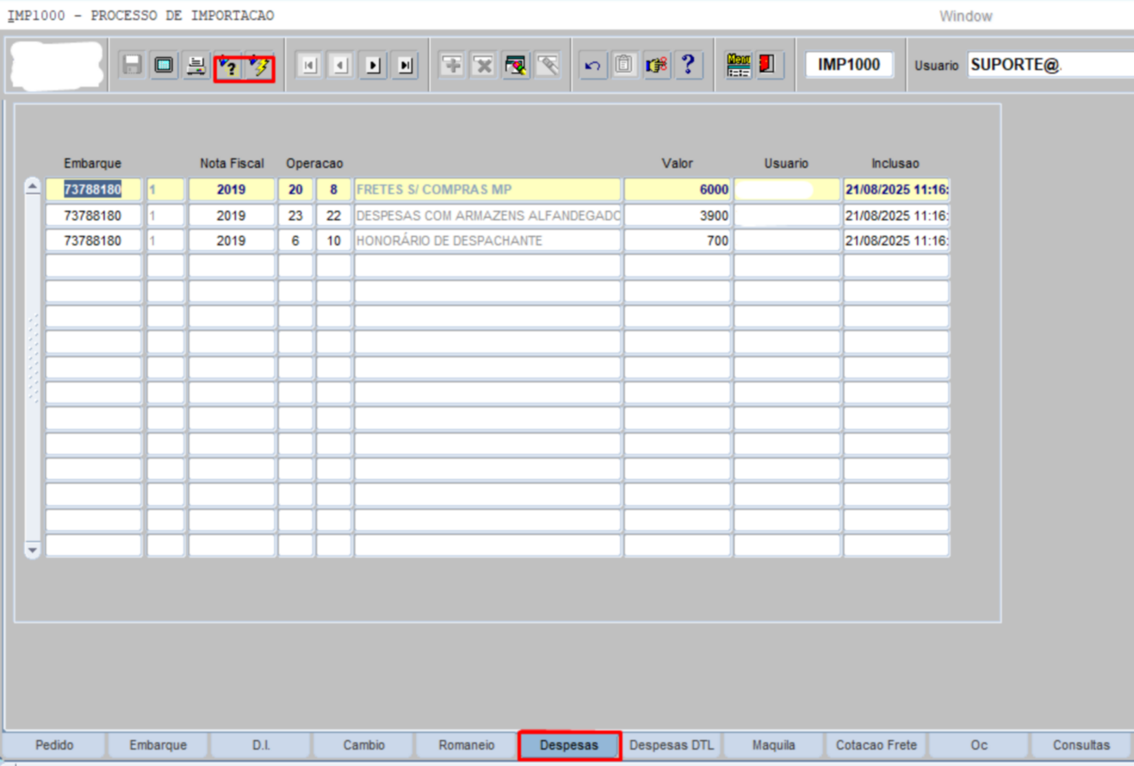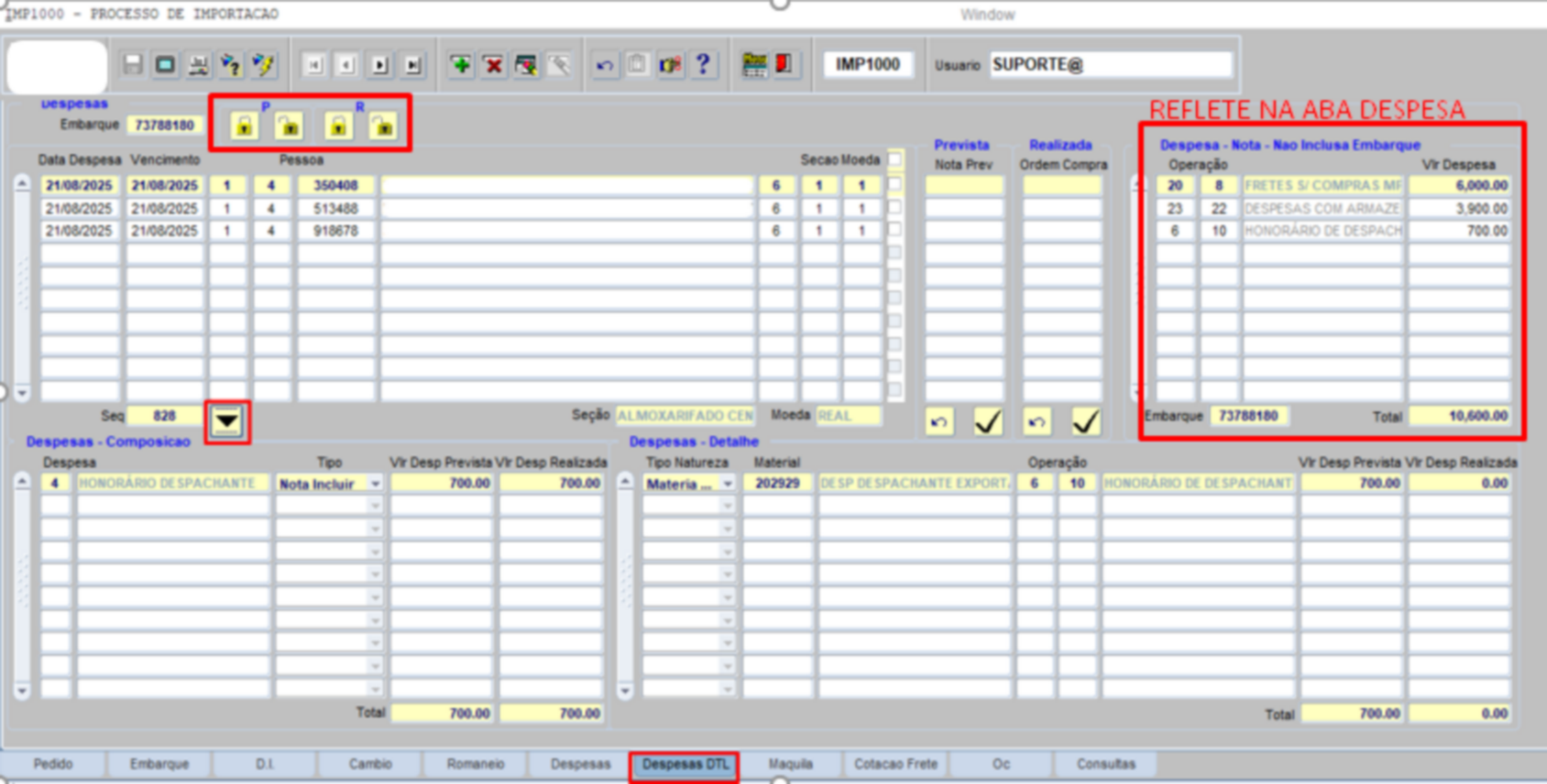•Despesa – Detalhe: Informadas no embarque.