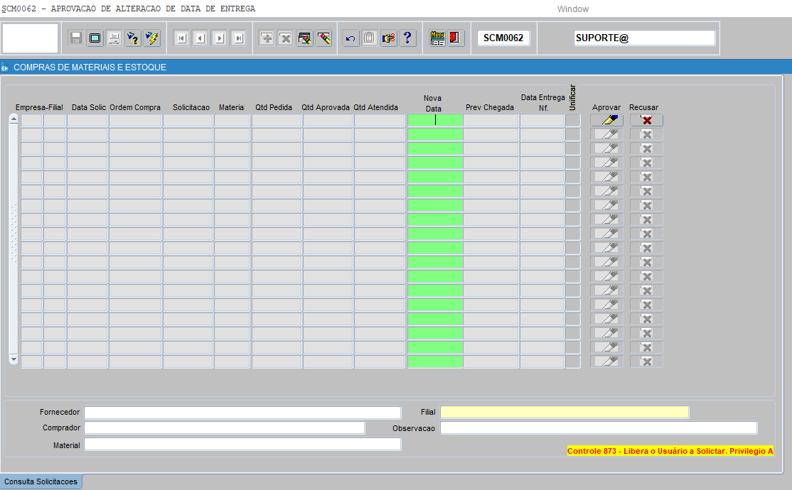 Essa tela um usuário efetua a solicitação de alteração, mas vai ser necessário que os aprovadores alocados efetuem a aprovação ou reprovação da solicitação, e essa aprovação ocorre na tela SCM0062 e SCM0063, os aprovadores precisam estar alocados no controle 873 como aprovadores.