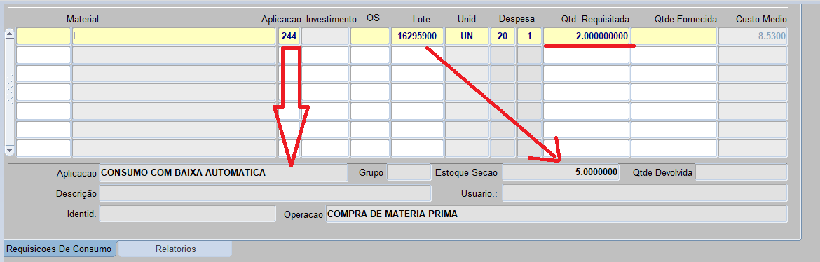Requisição de devolução: quando for uma devolução é obrigatório informar a requisição de consumo, senão é só pressionar TAB ou ENTER;