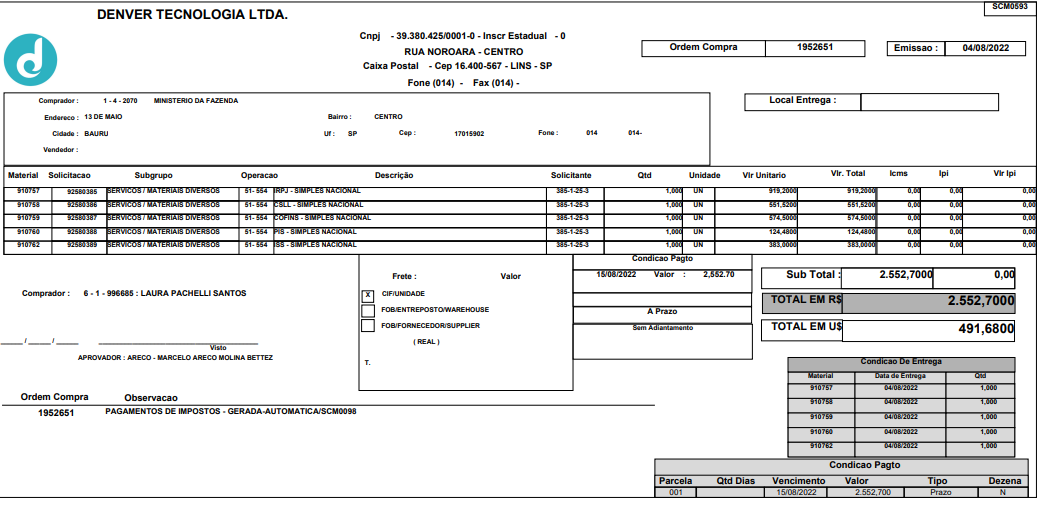 Campo Ordem informa qual o número da ordem de compra, com [duplo click] em cima do número o sistema gera o relatório da ordem de compra:
