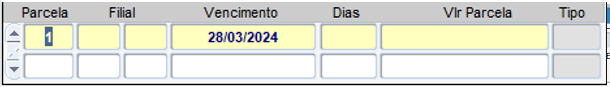 Após concluir o lançamento do cabeçalho o cursor irá para o lançamento da parte do financeiro no campo parcela: