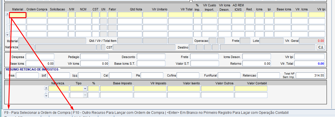 Efetue o lançamento do cabeçalho até chegar no campo MATERIAL pressionar [F9];