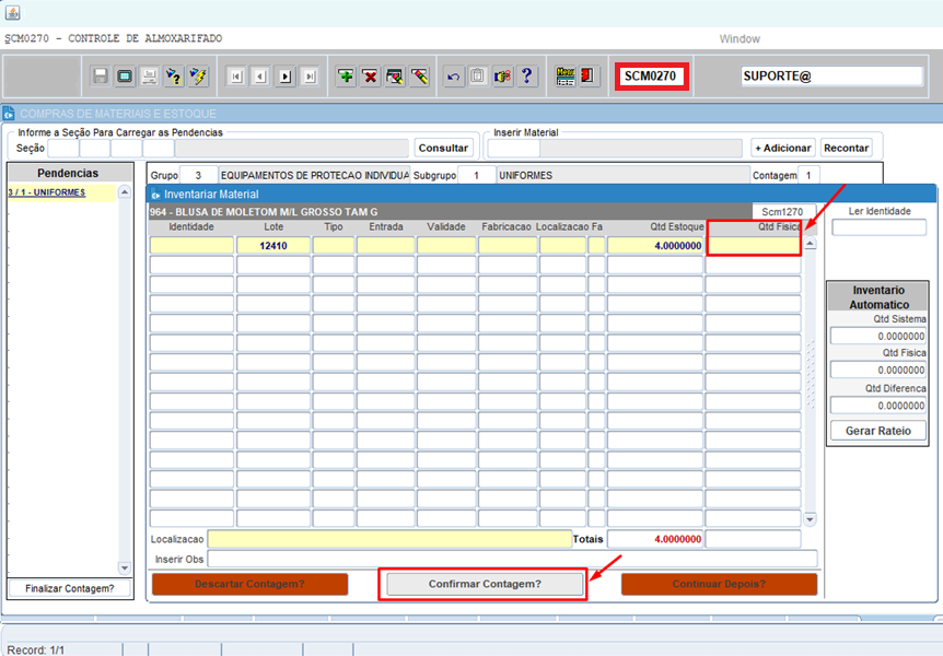 Informar a quantidade física (conferida in loco), pressionar [ENTER], e clicar em [CONFIRMAR CONTAGEM]: