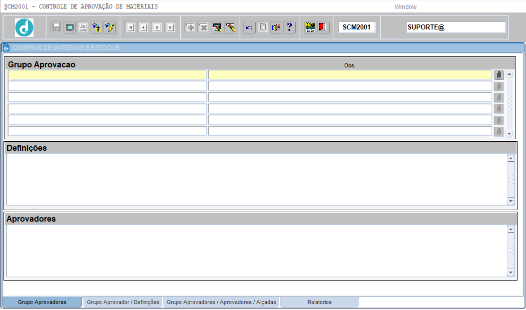 Esta tela serve para o usuário fazer o cadastro e gerenciamento dos grupos de aprovações para cadastros de materiais, feitas na tela SCM2003. Consultar manual da tela SCM2003 – CADASTRO DE MATERIAIS.