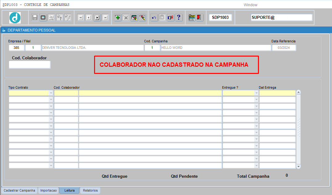 Caso ler o código de crachá um colaborador da mesma empresa, mas que não faz parte da campanha, o sistema retornará a seguinte mensagem![]()