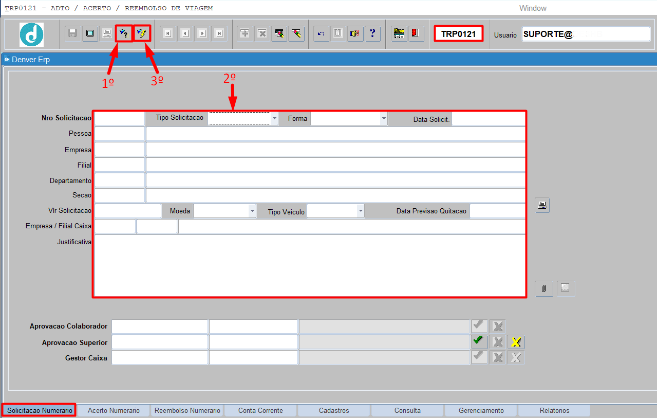 Ao preencher o número da solicitação, são alimentados os campos de empresa e filial caixa anterior de acordo com a solicitação digitada e os campos empresa e filial caixa são alimentados de acordo com o perfil do usuário cadastrado no TRP0128 de gestor de viagens.
